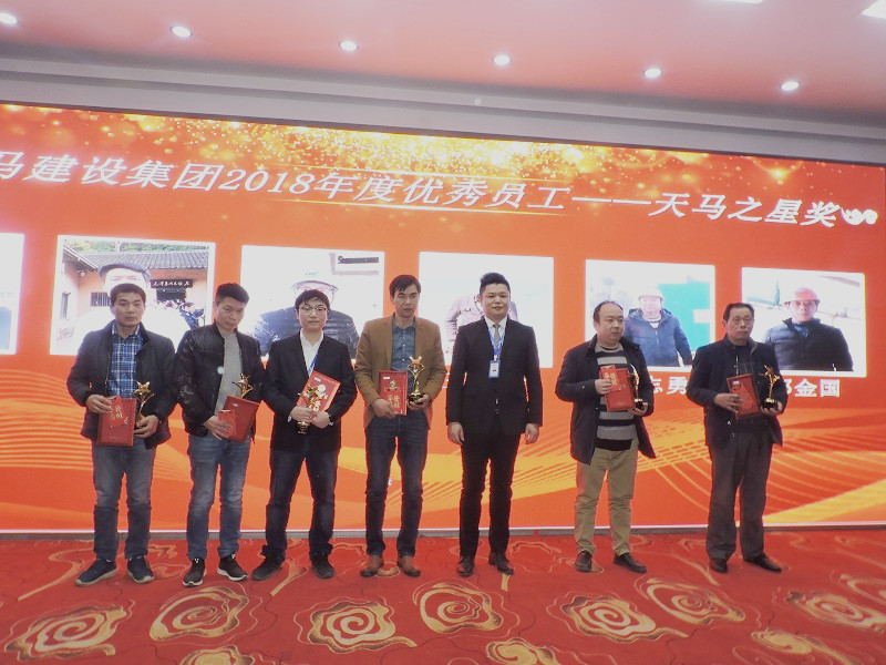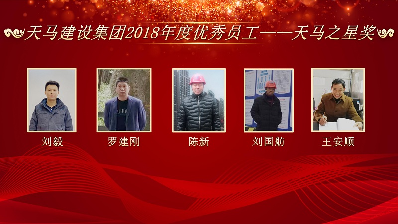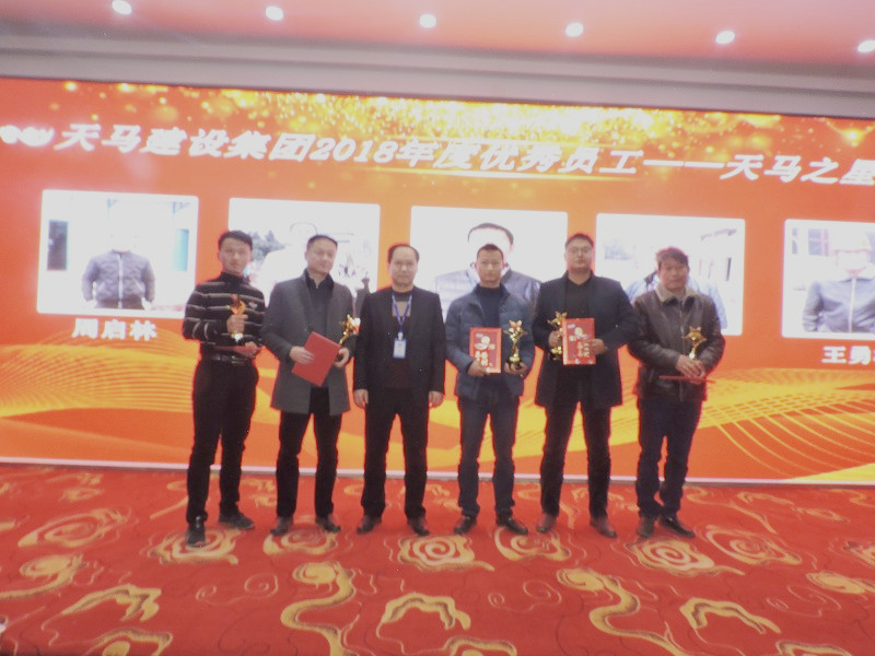 “2018年度優(yōu)秀員工——天馬之星獎”:“中石化項目” 施工員 劉 毅;“軍運會立面整治”項目經(jīng)理 羅建剛;“嘉魚高地項目” 技術(shù)負(fù)責(zé)人 陳 新;“利川觀瀾國際 項目副經(jīng)理 劉國舫;“襄陽項目” 項目經(jīng)理 王安順