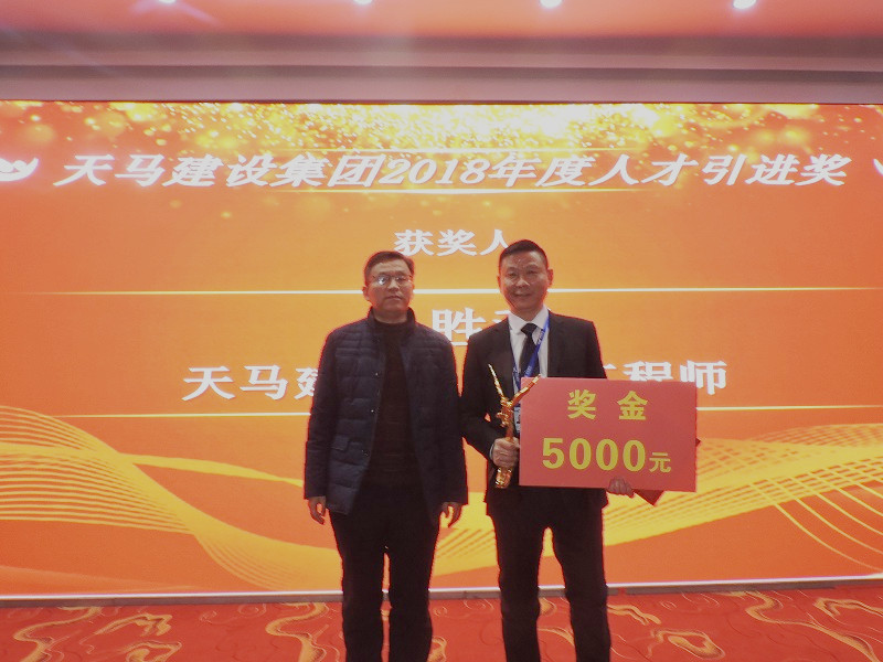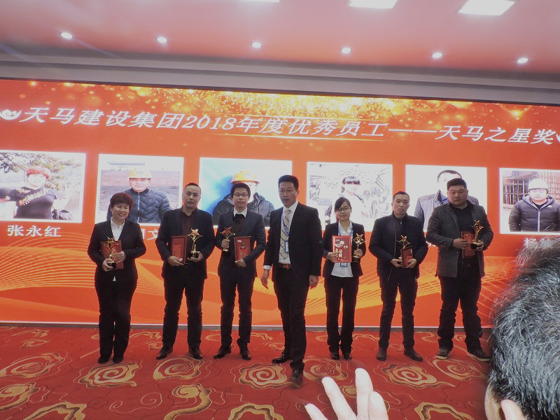 “2018年度優(yōu)秀員工——天馬之星獎”:“重慶黔江項目”棟號長 周啟林;“新疆九州通項目” 執(zhí)行經(jīng)理 胡小洲;“天門農(nóng)商城項目” 技術(shù)負(fù)責(zé)人 王良沖;“天地源工業(yè)廠房” 現(xiàn)場負(fù)責(zé)人 葛曉光;“美聯(lián)·奧園”項目 安全員 王勇林;頒獎人:集團公司綜合辦主任胡海華
