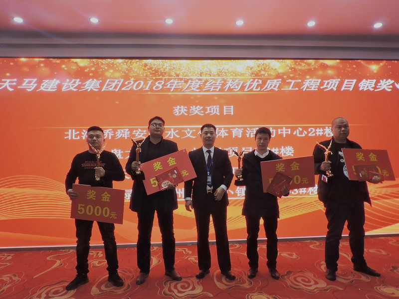“2018年度/結(jié)構(gòu)優(yōu)質(zhì)工程項目銀獎”:“北洋橋舜安碧水文化體育活動中心2#樓”、“盤龍廣場·虹墅項目H2#樓”、“天地源工業(yè)標(biāo)準(zhǔn)廠房二期”、“漢南綠地歐洲風(fēng)情小鎮(zhèn)八區(qū)”;頒獎人:集團公司工會主席李華彪