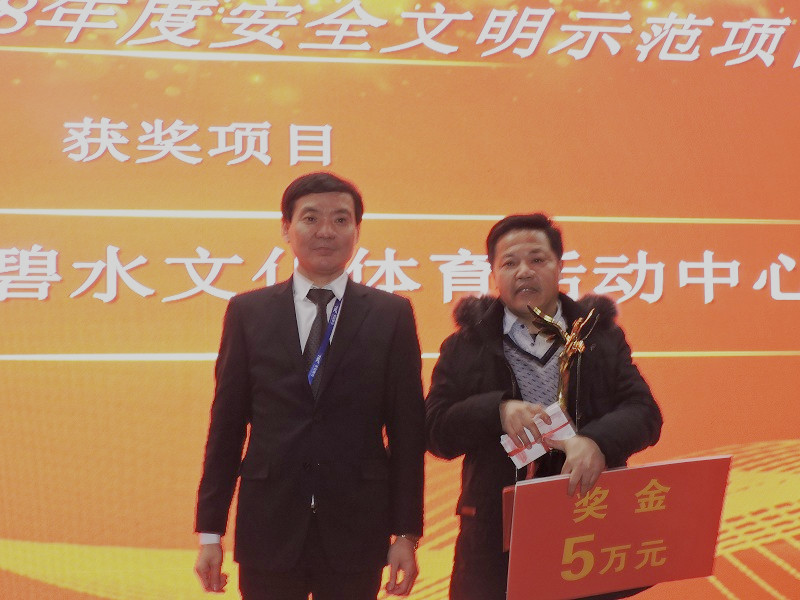 “2018年度安全文明示范項目金獎”:“北洋橋舜安碧水文化體育活動中心”;頒獎人:集團黨委書記、董事長馮義橋