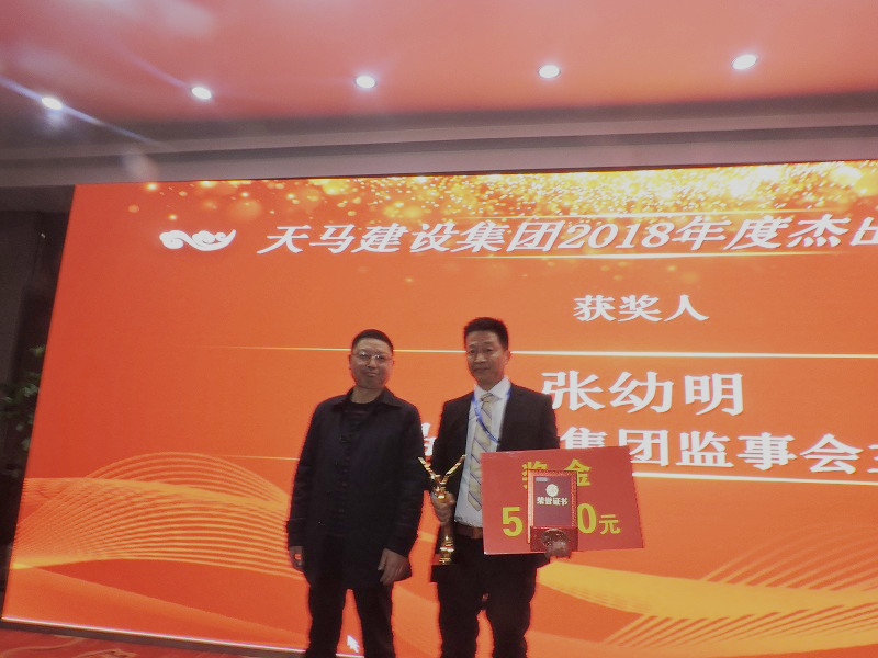 “2018年度優(yōu)秀員工——天馬之星獎”:“天馬建設(shè)集團”綜合部 張永紅;“經(jīng)開7#地塊” 施工員 操國文;“經(jīng)開9#地塊” 施工員 王 成;“天馬建設(shè)集團” 財務(wù)部 何 歡;“武漢光谷電信項目” 生產(chǎn)經(jīng)理 靖雙紅;“五里界恒大項目”棟號長 楊放;頒獎人:集團公司監(jiān)事會主席張幼明