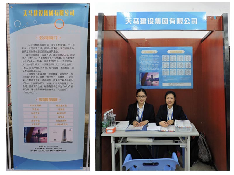 董事長馮義橋和執(zhí)行總經(jīng)理高昌盛出席了活動,并履行社會責任,大力支持百萬大學生留漢創(chuàng)業(yè)就業(yè)計劃,在就業(yè)大樓招聘廳開設天馬建設招聘專區(qū)招攬高素質人才。提供12個崗位信息,現(xiàn)場達成近40個就業(yè)意向。