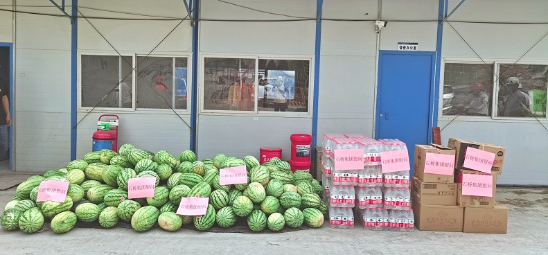 入夏以來,隨著氣溫的不斷升高,工人露天施工作業(yè),體能消耗非常大,為了切實(shí)做好一線工人的防暑降溫工作,武漢石橋集團(tuán)為項(xiàng)目部送來了3000斤西瓜、20箱礦泉水、綠豆、冰糖、蚊香、花露水等防暑降溫防蚊用品,為施工一線送清涼、送安全、送健康。把清涼送到了一線工作區(qū)域,把關(guān)懷送到了工人心坎。