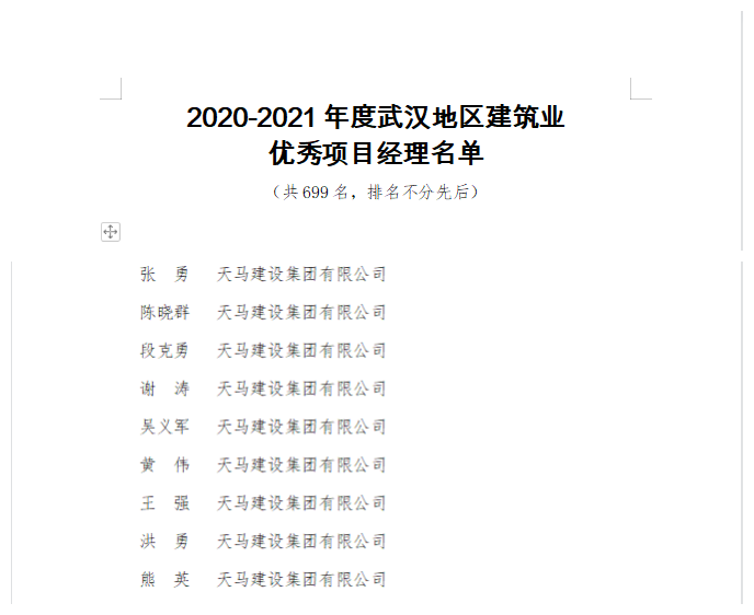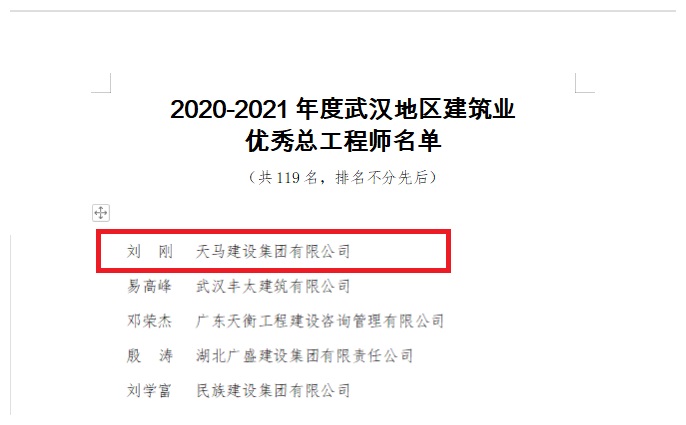 同期,協(xié)會(huì)還發(fā)布了建筑“四優(yōu)”等多項(xiàng)榮譽(yù),公司榮獲武漢地區(qū)建筑業(yè)優(yōu)秀企業(yè);董事長馮義橋獲評(píng)“優(yōu)秀企業(yè)家”、總工程師劉剛獲評(píng)“優(yōu)秀總工程師”;項(xiàng)目經(jīng)理張勇、黃偉、吳義軍等9人獲評(píng)“優(yōu)秀項(xiàng)目經(jīng)理”。